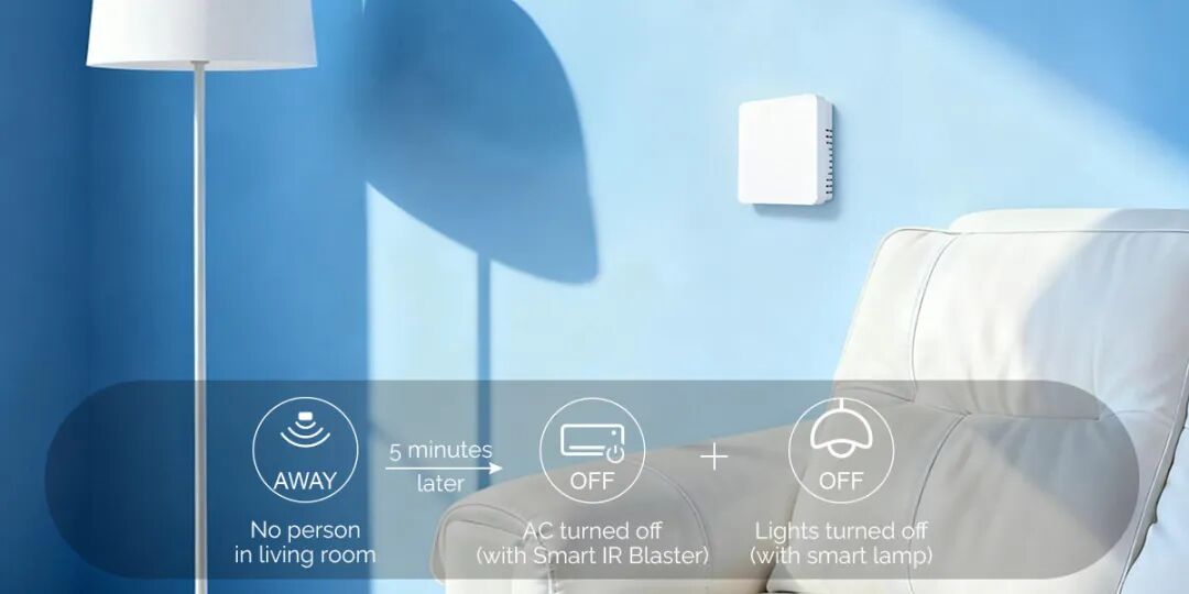 精准感知人体存在,自动触发智能场景:当检测到客厅无人5分钟后,空调与灯光将自动关闭,既提升生活便捷度,又能有效节约能源。