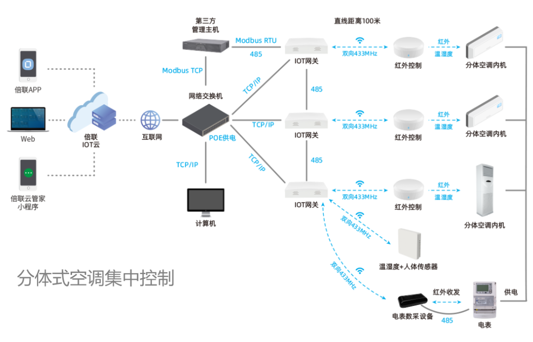 倍联云空调将传统空调以超低成本上云管理,通过数字孪生技术将建筑的空间、环境、设备和人完整映射到倍联云平台,在相同标准下互联互通,管理者通过不同权限登录即可集中管理和控制接入平台中的空调(分体、多联机、单联机及水系统空调均可)。通过稳定的433MHz双向非对称加密协议,将空调控制、环境感知及电能监测设备通过无线稳定连接。通过平台智能运行策略、联动引擎和 AI 预测模型自动化控制执行,做到分区分策、按需对空调进行恒温调控,提升用户体验的同时降低门店运行能耗。