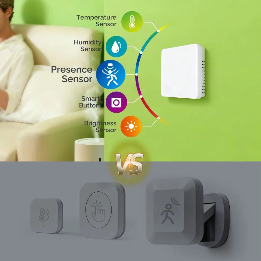 集成人体存在、温度、湿度、光照检测及智能按键功能,一台设备替代多个传感器,大幅降低智能家居部署成本。