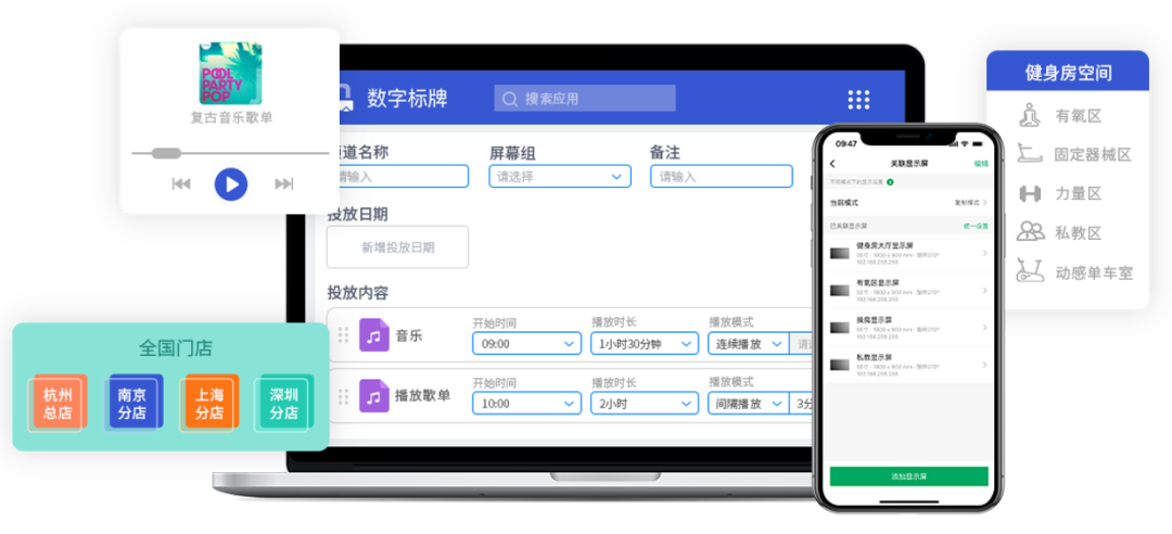 倍联数字标牌解决方案,将屏幕管理、信发系统、门店背景音乐管理统一整合到平台,通过WEB或APP远程管理门店运营所有屏幕和内容,运营上百家店就像管理一家门店那样简单;海量版权背景音乐全球授权,配置一次各地同步生效;分区控制,各个空间分别创建频道和节目单,定时\周期\循环播放上传内容;分配权限,店长随时插播临时内容及语音等,每个分区可单独管理,互不影响;轻松规划投放内容排期,定时发布,远程管理,让运营省心省力。
