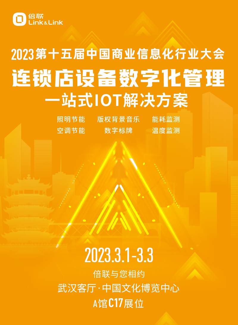 2023年3月1-3日,2023第十五届中国商业信息化行业大会暨展览会将在武汉客厅·中国文化博览中心拉开帷幕。行业新锐——杭州倍联低碳科技有限公司将携连锁店设备数字化管理一站式IOT解决方案亮相展会,向参观者展示倍联如何以数字化能力为核心,助力零售品牌快速实现门店场景化、智能化的数字化转型。